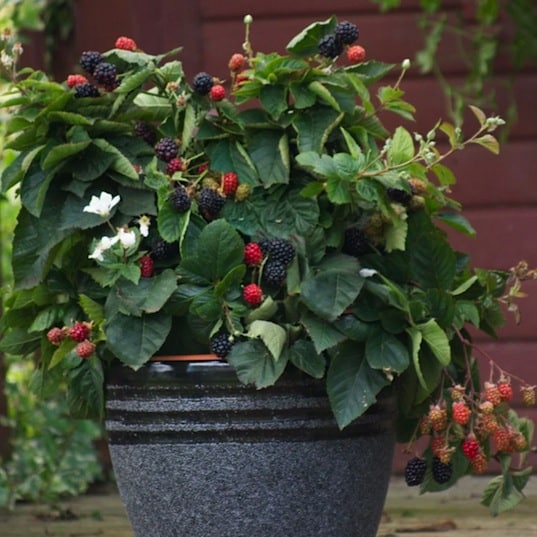 Attraitsmûrier nain, compact et sans épines. Ce mûrier produira deux fois en une saison ! Peut prospérer dans un contenant ou dans le jardin. Petits jardins.